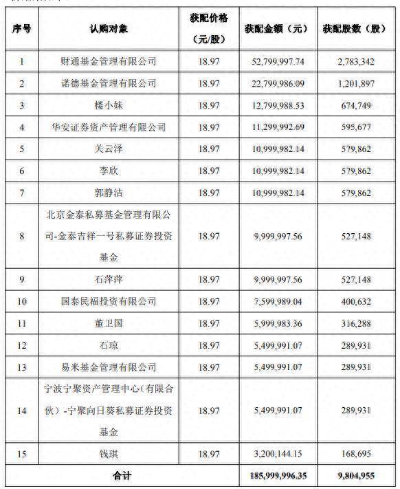 从获配情况来看,财通基金获配金额最高,达52,799,997.74元,获配股数2,783,342股。诺德基金紧随其后,获配22,799,986.09元,获配股数1,201,897股。此外,楼小妹、华安证券资管公司等机构和个人投资者也参与了本次认购。